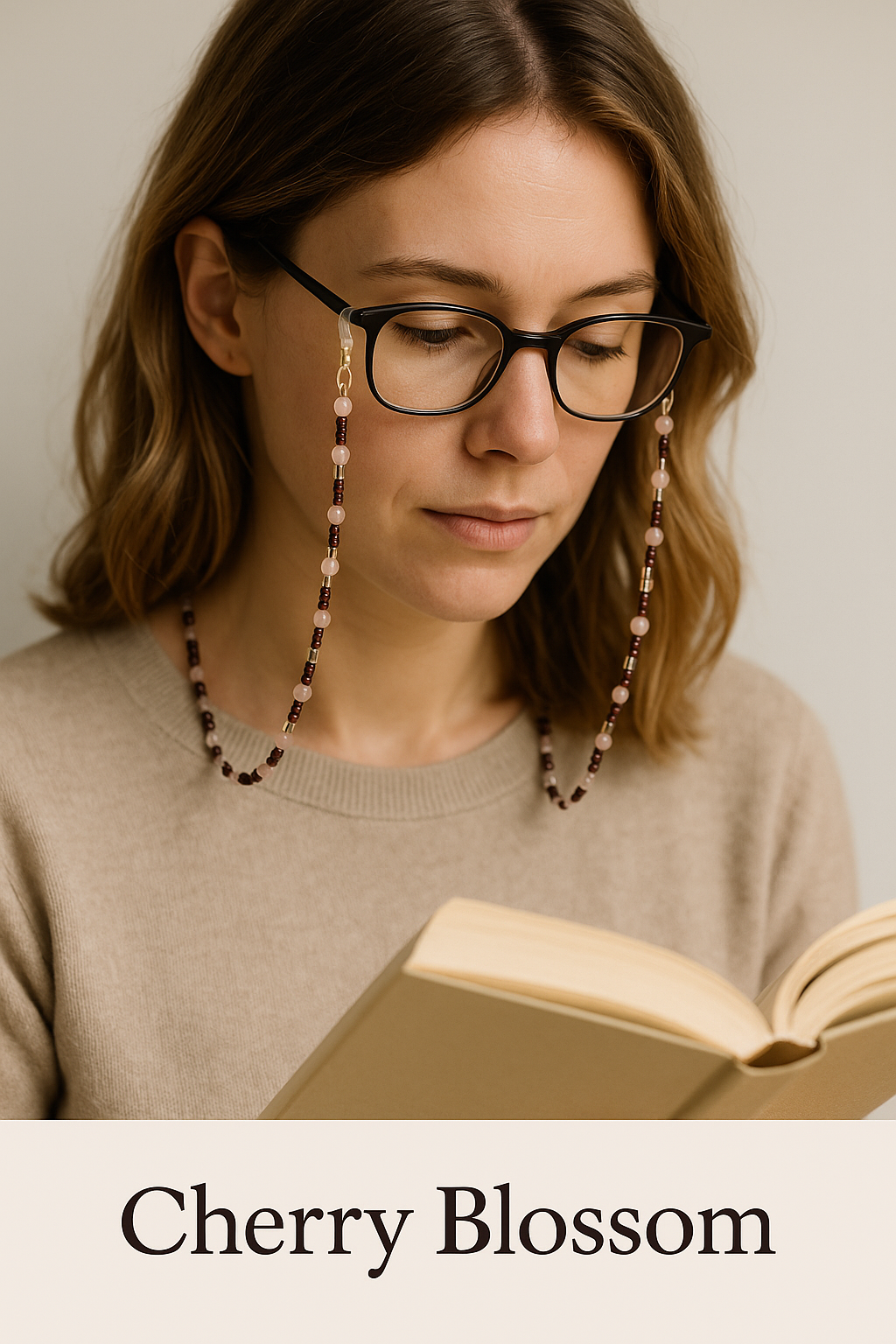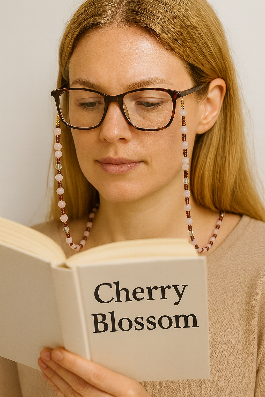 The Cherry Blossom eyeglass catcher is crafted with soft pink rose quartz, clear crystal, and deep garnet-colored beads accented with gold. This design brings a refined look to everyday wear while offering a practical way to keep your glasses close at hand. Stylish and functional, it adds a touch of elegance whether you’re reading, working, or on the go.