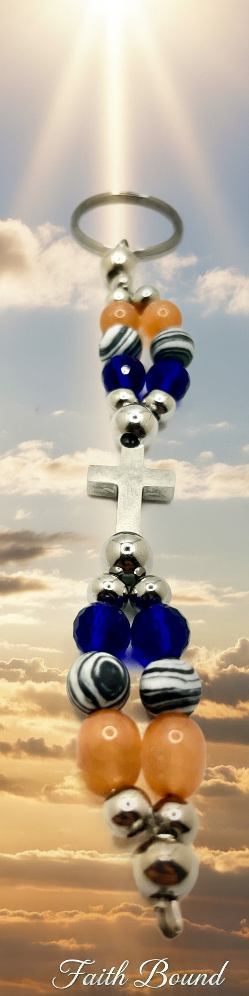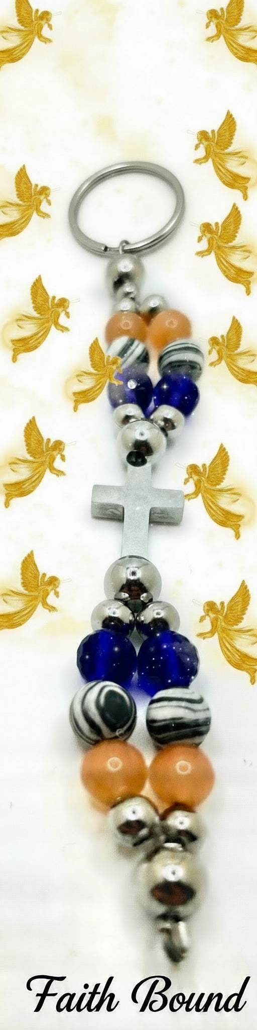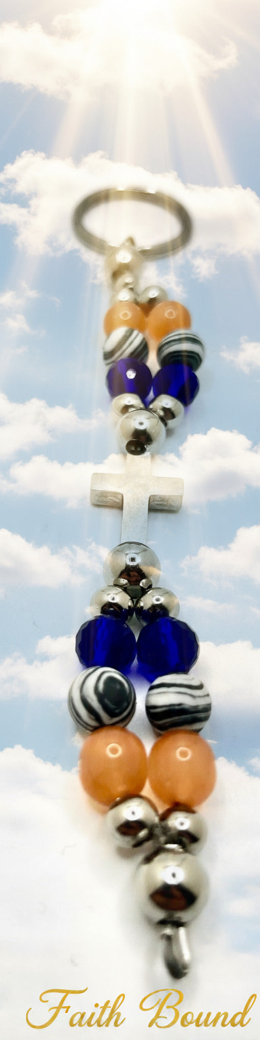 Materials: 8mm cobalt blue crystals, 8mm orange rounds, 8mm gray and white malachite, 6–8mm silver rounds, and a silver inlay cross with a polished key ring.