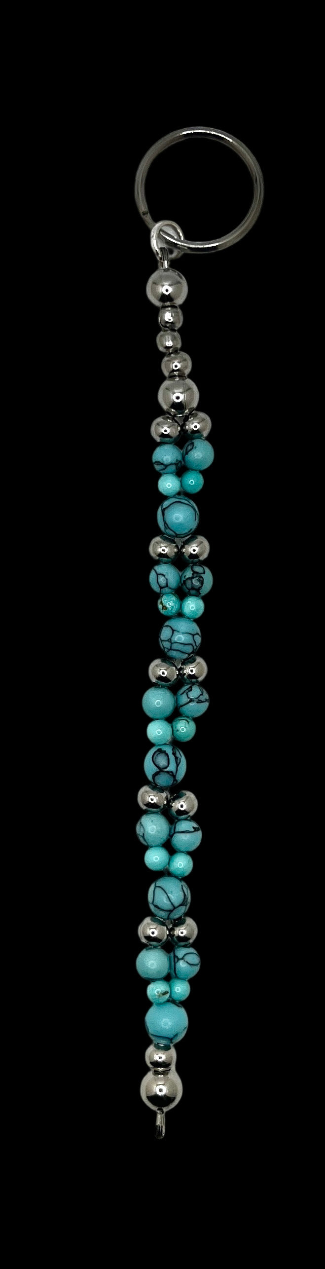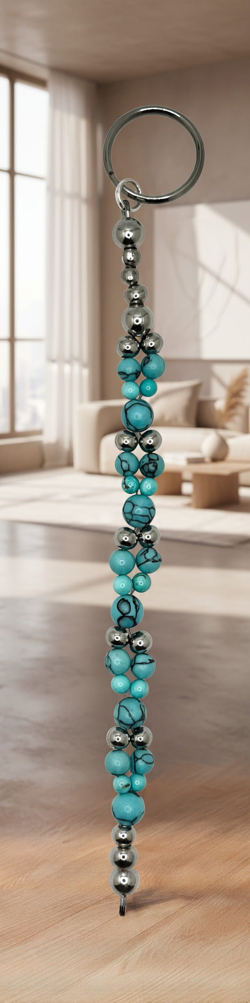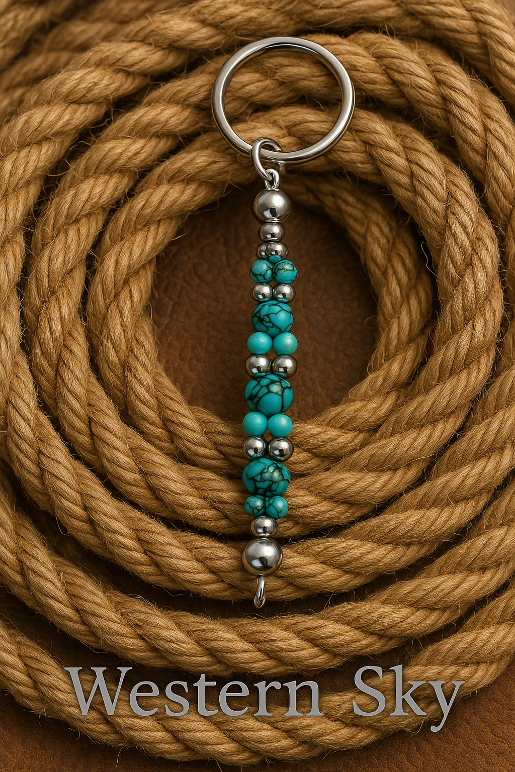 The Western Sky keychain captures the spirit of open plains and endless horizons. Created with natural 8mm and 6mm turquoise stones paired with polished silver beads, it reflects the cool tones of desert skies and the rugged beauty of the West.