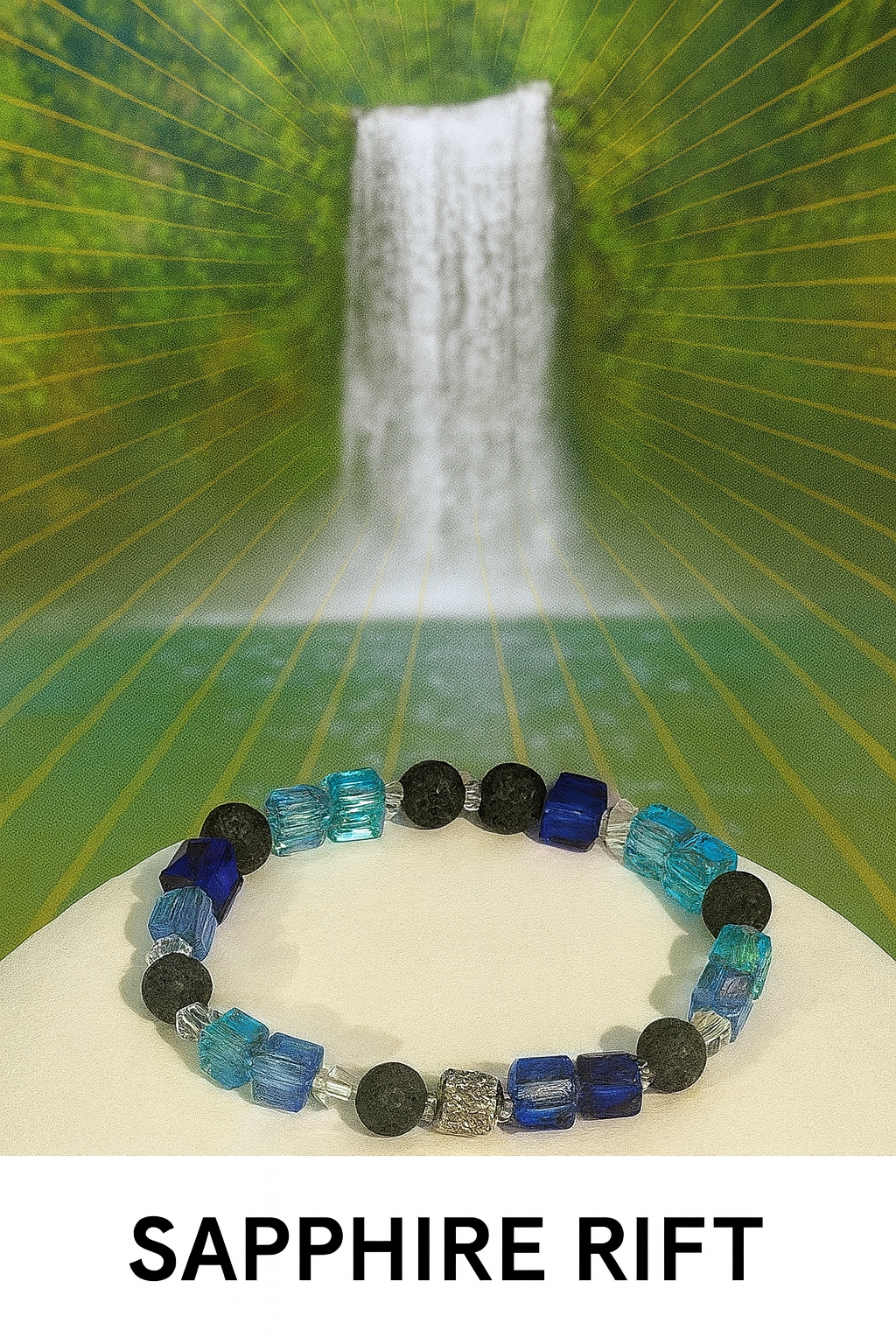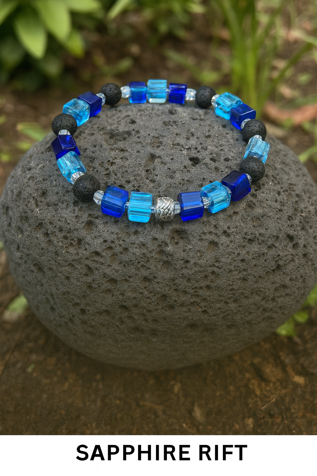 The lava stones not only add grounding texture but also allow you to infuse the bracelet with a drop of your favorite essential oil or perfume—keeping a subtle scent with you all day long. Both refreshing and powerful, Sapphire Rift is the perfect piece for those who want elegance with a bold edge.